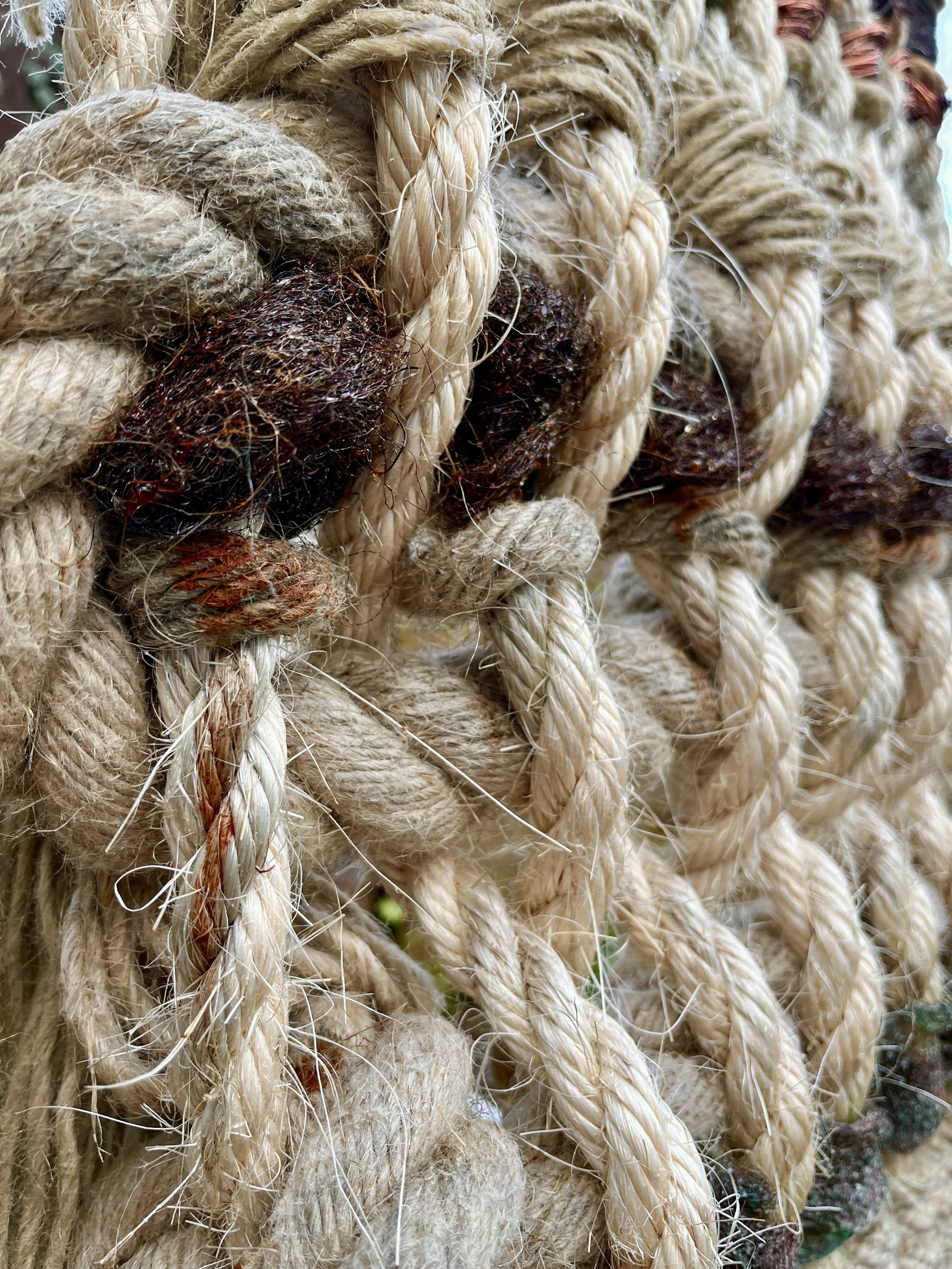 Multiple types and thicknesses of natural ropes have been combined with steel, brass and copper to create a piece which gives a sense of traditional shipbuilding. Woven together to show how interdependent these materials would have been, and inspired by the complex rope rigging criss-crossing large historic wooden ships. Left outside to weather; the steel rusting, the copper and brass developing a greenish verdigris patina, developing the aged appearance if out to sea on a ship.